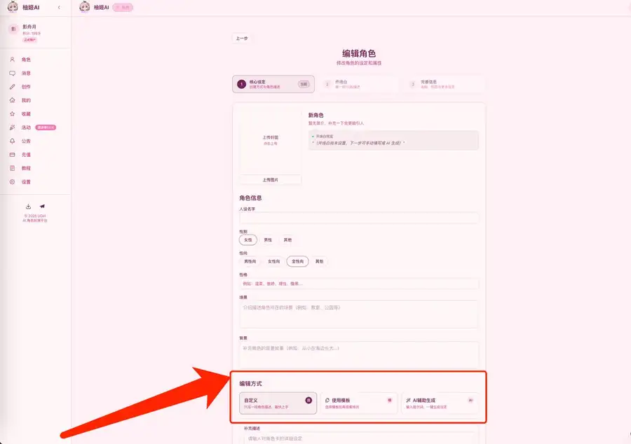 我们的创建角色分为自定义、使用模板、AI辅助生成三个模块,新手建议去自定义创建模式,第一次上手你可以用自定义创建模式,现根据你的想法,就像写作文一样吧想法写入进去,然后按照界面步骤,一步一步来最后创建完成